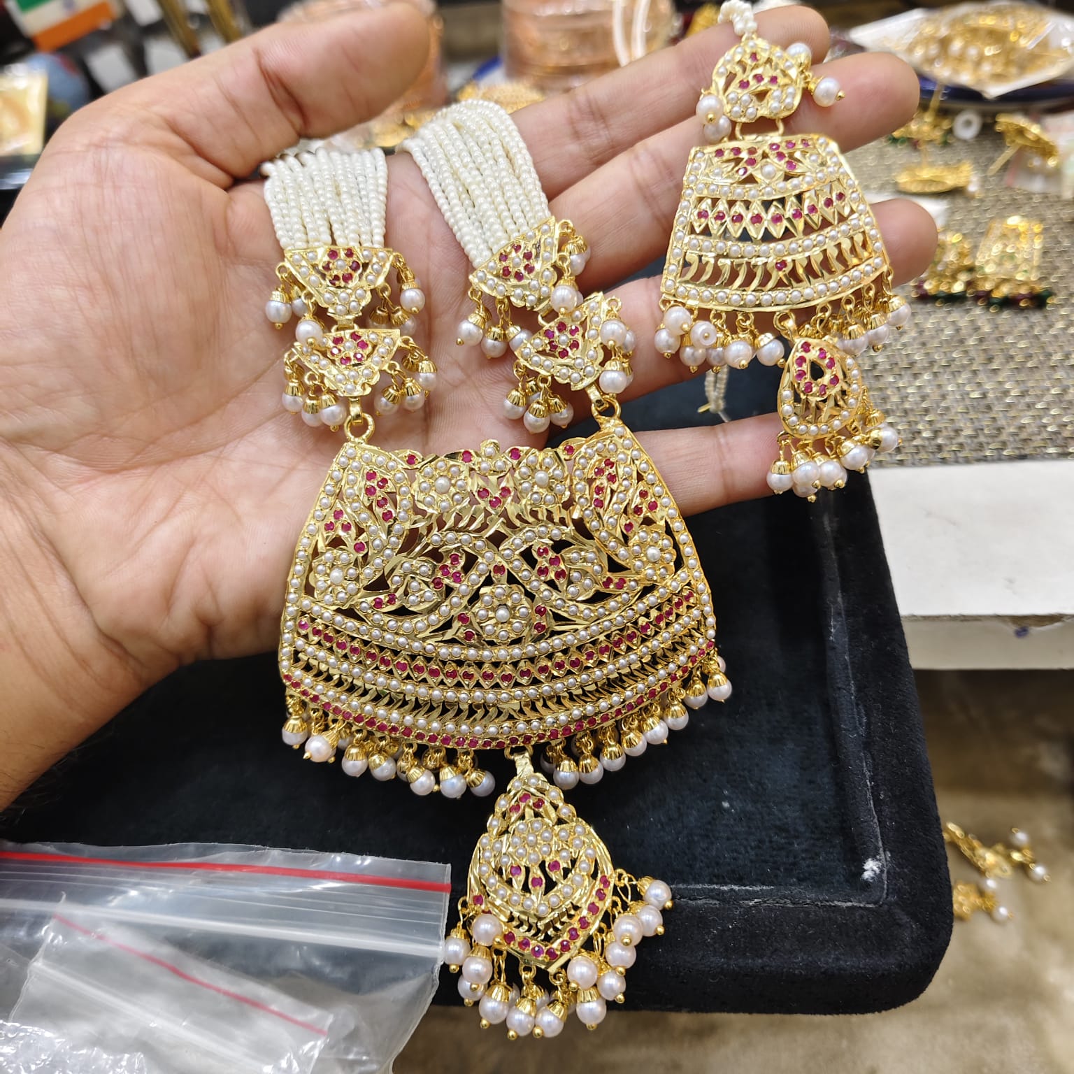 In Stock22 Carat Gold Plated Fashion Jadau Punjabi Rani Har With Tikka, This Quality is very Premium, All Stones are Fitted & Repolishable Jewellery.
