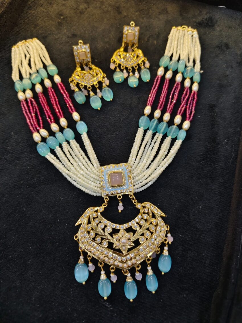 Indulge in the perfect blend of tradition and contemporary style with our Firoza Pink Jadau Choker Set. Designed to elevate your bridal or festive look, this exquisite set features a stunning choker necklace adorned with firoza (turquoise) pink stones, delicate kundan work, and intricate pearl detailing. The soft pink hue combined with the striking firoza stones creates a unique color palette that stands out while maintaining a classic elegance.