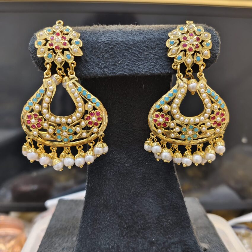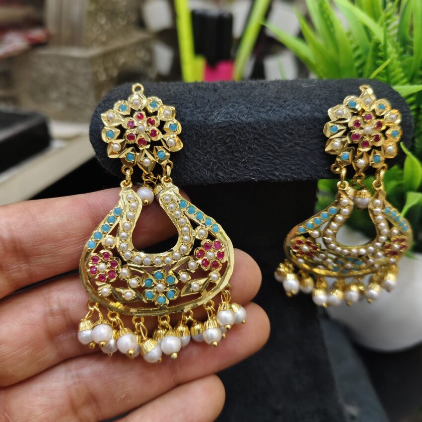 Designed by experienced Jadau Jewelry Manufacturers, this pair showcases authentic kundan-style jadau craftsmanship. Each earring is adorned with hand-set semi-precious stones in vibrant ruby red and soothing turquoise firoza hues. The multicolored palette ensures versatility—effortlessly complementing various outfits and skin tones.