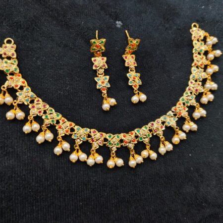 Our Jadau Choker Set is manufactured with 22K gold plating, semi-precious stones, and a lightweight build, ensuring both comfort and long-lasting shine. Every piece is re-polishable and crafted to premium quality standards, giving you the richness of heritage jewelry with the durability modern wearers expect. Handcrafted by skilled artisans using time-honored jadau techniques, this necklace also features an adjustable thread tie for a perfect fit. The included matching earrings mirror the choker’s design and complete the look with perfect elegance.