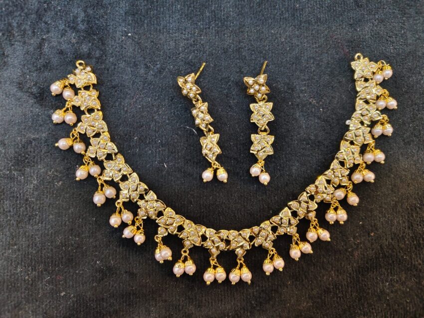 The design draws inspiration from traditional Punjabi and Mughal aesthetics, blending uncut kundan stones with subtle pearl embellishments for a soft, regal finish. Its versatile styling allows you to wear it with bridal lehengas, pastel sarees, or even elegant fusion wear. The neutral white tones of the pearls complement all skin tones, making this piece a staple in any ethnic jewelry collection.
