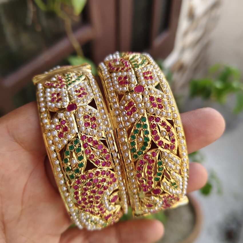 These jadau kade are a tribute to rich Punjabi and Rajasthani jewelry-making traditions. The multi-colour stones symbolize joy, diversity, and prosperity, set intricately with precision in a design that stands out with regal flair. Whether worn alone or paired with a full bridal set, these bangles enhance every ethnic ensemble with grace and grandeur.