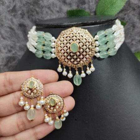 Celebrate the vibrance of Indian tradition with our Navratan Jadau Necklace Set, a colorful and majestic creation that captures the essence of cultural richness. This handcrafted necklace features the traditional Navratan (nine-stone) arrangement, representing nine celestial gemstones, paired with intricate jadau work and radiant kundan accents. It comes complete with matching earrings, making it the perfect jewelry set for brides and women who love bold, spiritual, and meaningful designs.