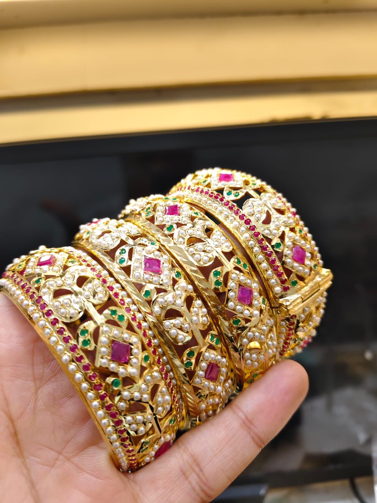 Each cuff is skillfully handcrafted using 22K gold plating and semi-precious stones, delivering the perfect blend of luxury and durability. The combination of radiant pearls and detailed kundan-style settings creates a classic design that pairs beautifully with sarees, lehengas, and anarkalis.
