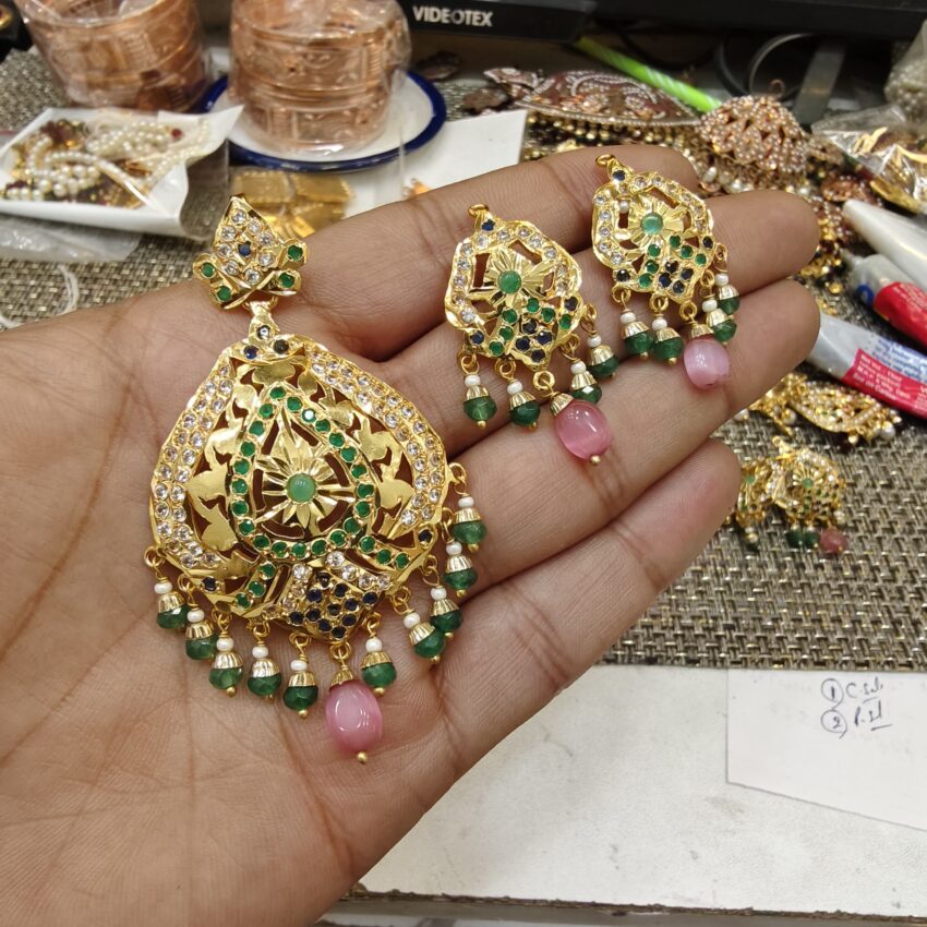 Enhance your ethnic look with our Green Jadau Pendant Set, beautifully handcrafted with intricate Kundan and Polki work. This traditional jewelry set includes a stunning pendant with matching earrings, perfect for weddings, festivals, and cultural events. The rich green stones set in antique gold plating offer a royal and timeless appeal, ideal for those who love classic Indian jewelry styles. Whether you’re a bride or attending a special function, this artificial Jadau jewelry set adds elegance and charm to any outfit.
