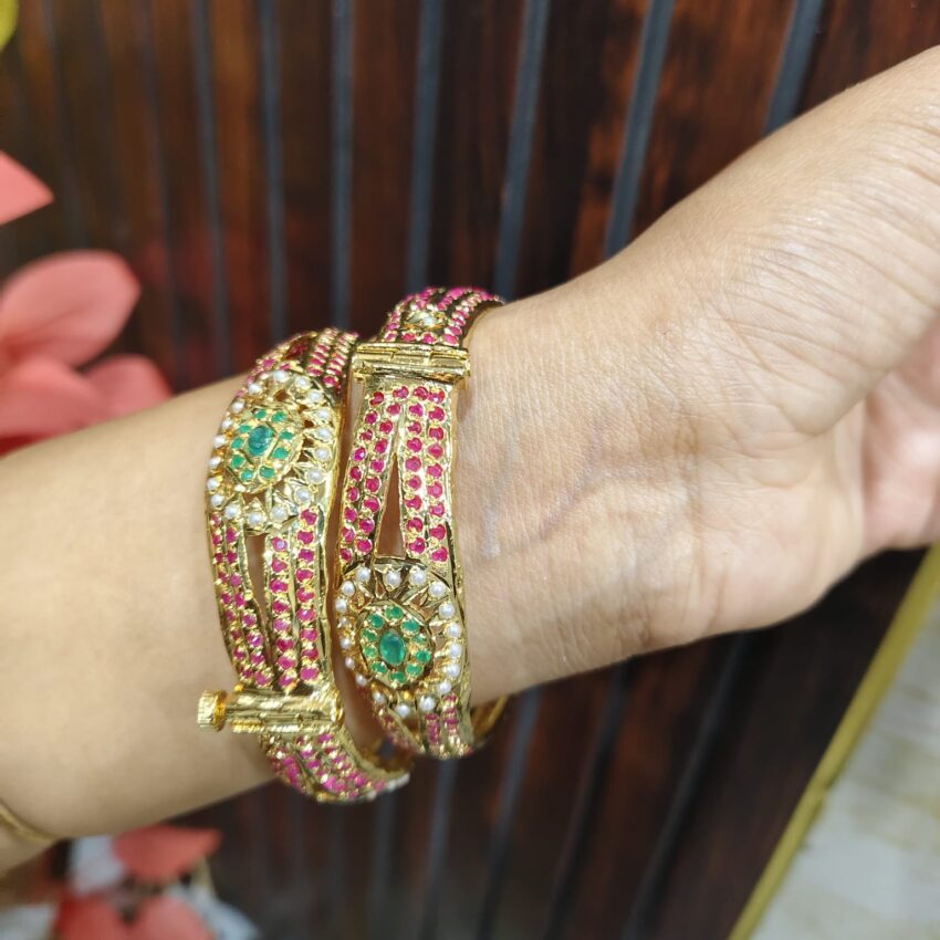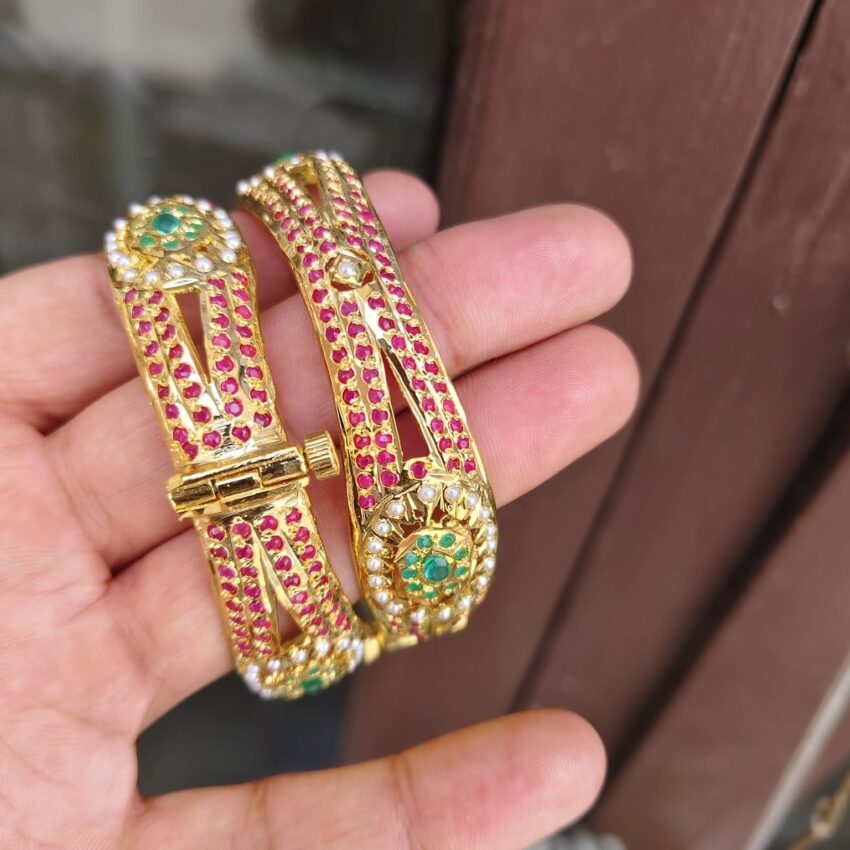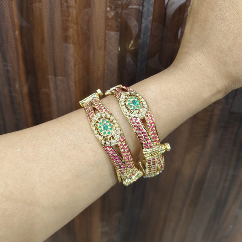 This bangle is 22K gold plated, giving it a premium finish that pairs beautifully with any traditional outfit—whether it’s a bridal lehenga, a festive saree, or an elegant salwar suit. The brilliant hues of ruby and green bring auspicious energy and a luxurious aesthetic to your wrist, ensuring you stand out in any setting.