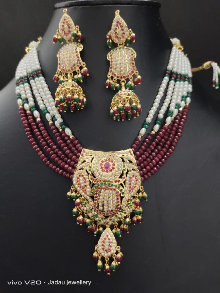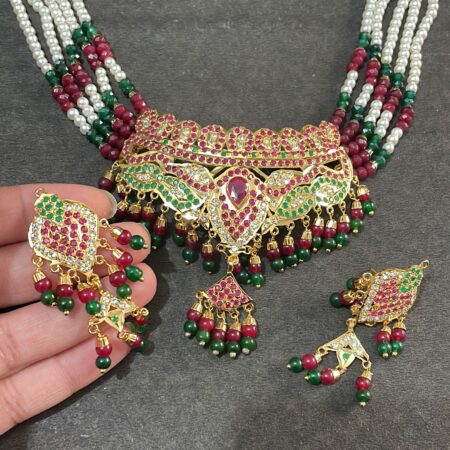 - Step into the spotlight with our Ruby Green Jadau Choker Set, a bold and beautiful blend of royal elegance and traditional Punjabi craftsmanship. This handcrafted choker features radiant ruby-red and emerald-green stones, intricately set in a gold-tone base using age-old jadau techniques. Accompanied by perfectly matching earrings, this set is designed to elevate bridal and festive looks with timeless sophistication.