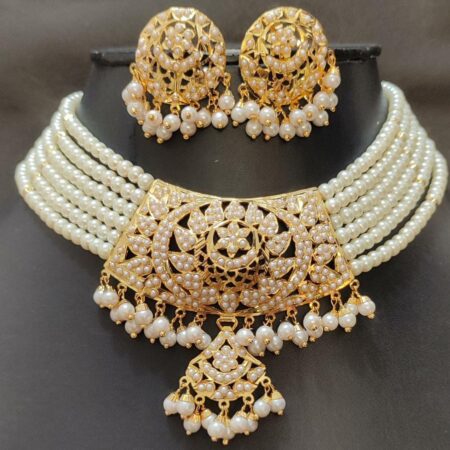 Each piece is artisan-crafted with precision and care, using traditional jadau settings that highlight both elegance and durability. The choker sits comfortably around the neckline with an adjustable thread tie, ensuring a custom fit, while the lightweight earrings offer a touch of coordinated glamour without compromising on comfort.