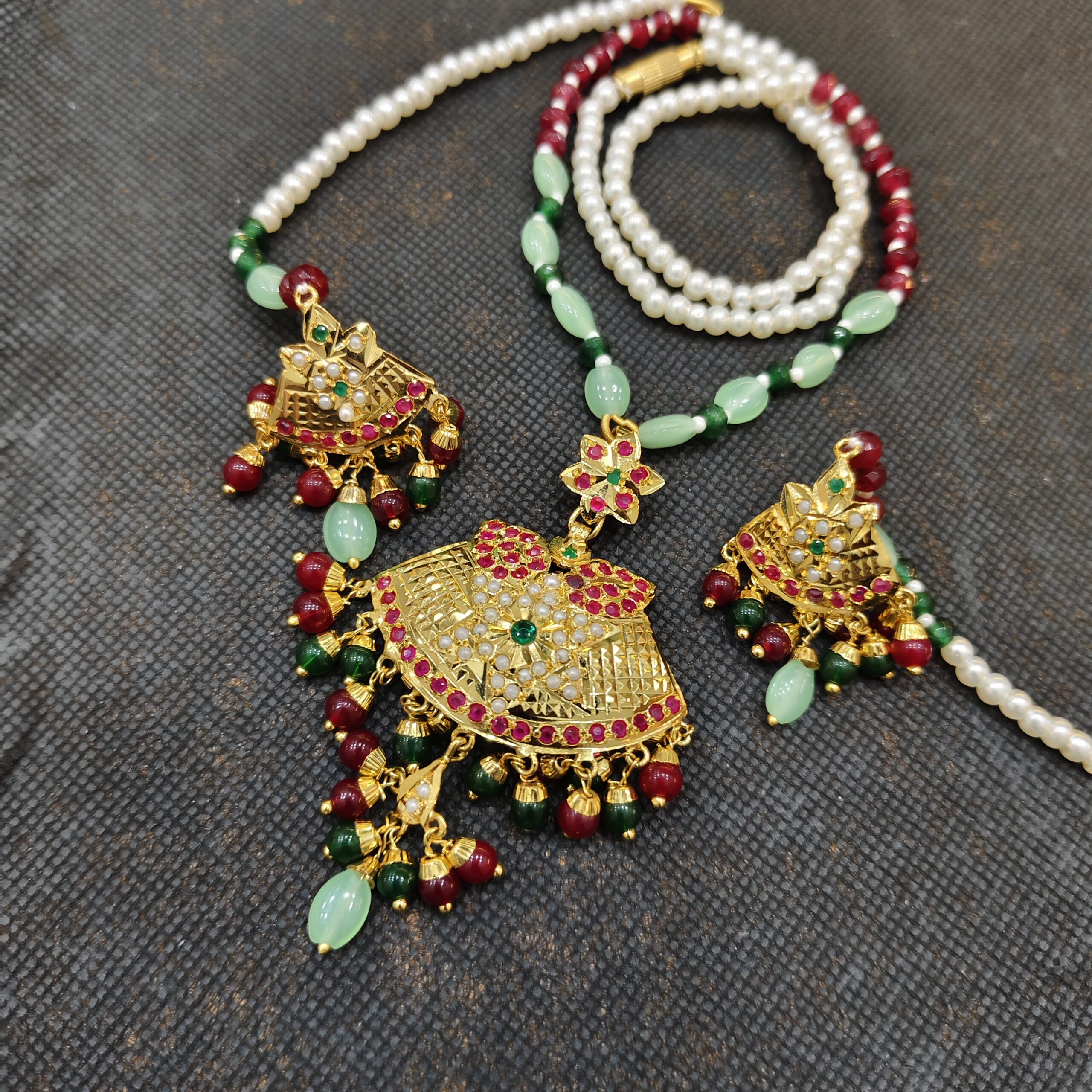 This pendant set is handmade by expert artisans and finished in luxurious 22K gold plating to give it a radiant antique look. Embedded with semi-precious stones, it features detailed Jadau work that reflects timeless craftsmanship. Whether paired with a lehenga, saree, or traditional suit, this set will instantly enhance your festive or bridal look.