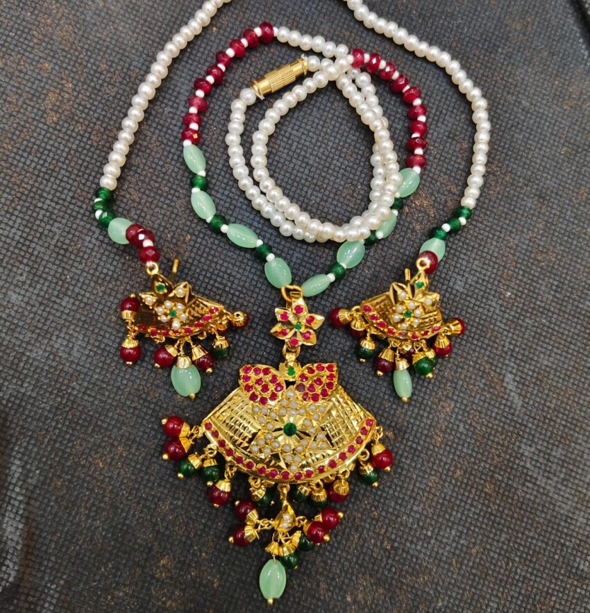 Elevate your ethnic elegance with our Ruby Green Jadau Pendant Set, crafted with precision and cultural richness. The vibrant combination of ruby red and emerald green stones adds royal flair, making this set perfect for weddings, festivals, or special occasions. The pendant, along with matching earrings, brings together the grace of traditional Punjabi design with modern-day sophistication.