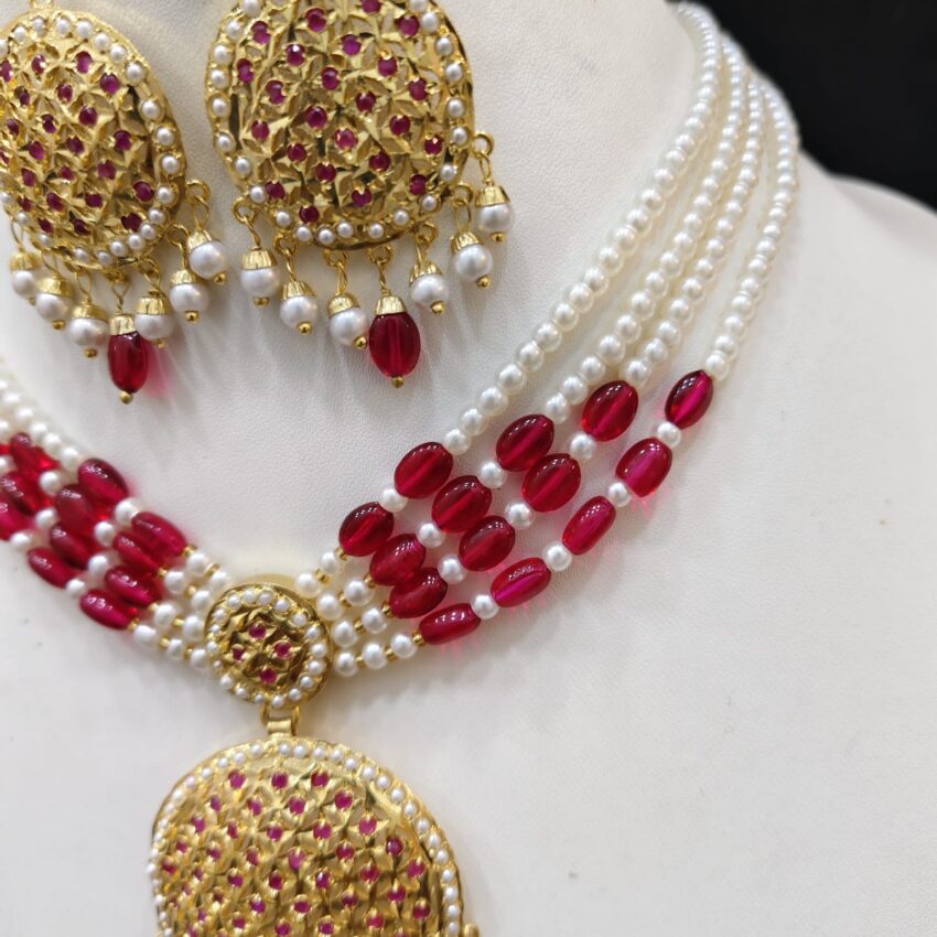 Turn every occasion into a royal moment with our Ruby Pearl Jadau Choker Set, a luxurious blend of elegance and cultural heritage. Adorned with deep ruby stones and soft white pearls, this handcrafted choker set reflects the richness of traditional Punjabi jewelry. It’s a perfect pick for brides, festive celebrations, or anyone who wants to add a bold and classic touch to their ethnic look.
